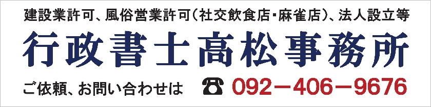 | 福岡の建設業許可、風俗営業許可、法人設立等 行政書士高松事務所 代表行政書士 高松 隆史 ☎092-406-9676 *メールはこちらからどうぞ 平日9:00~18:00(土曜12:00) 前もってご連絡頂けば、日曜・祝祭日・時間外も対応します。 |